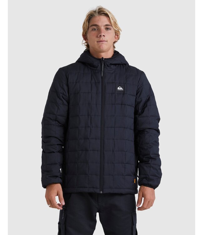 The Mens Stormz Bomber Jacket by Quiksilver is designed to offer both style and protection against the elements. Made from a durable nylon polyester blend, this jacket features a regular fit and a hooded neck with a fixed 3-panel hood. Its DWR fabric treatment ensures water repellency, keeping you dry during rainy days.