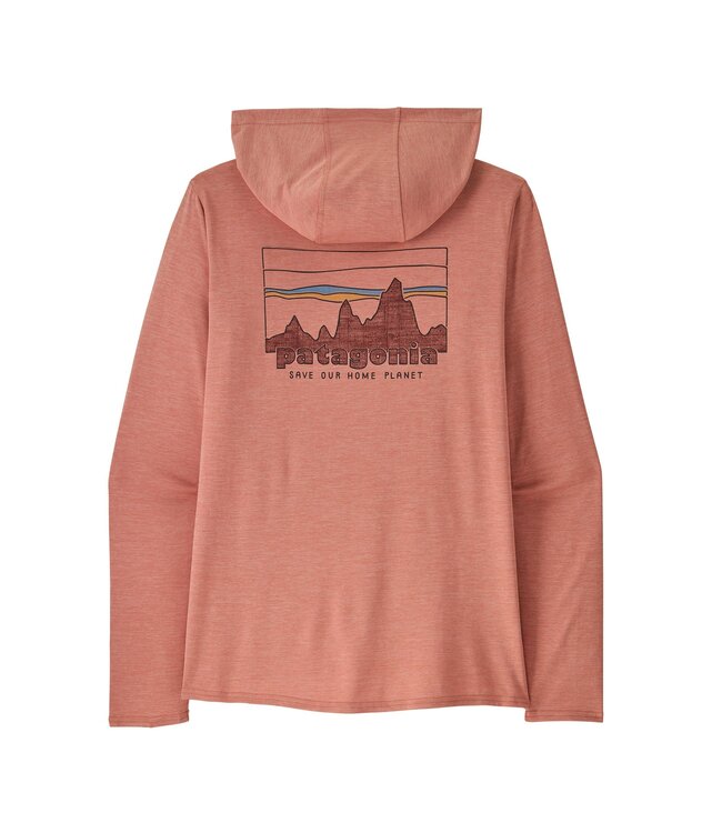 The Patagonia Women's Capilene Cool Daily Graphic Hoody is designed for versatility from trails to water activities. It offers a technical top that is quick-drying, stretchy, and comfortable for long-lasting wear. This hoody features a set-in sleeve design that enhances mobility and fit, while the deep hood provides sun protection.