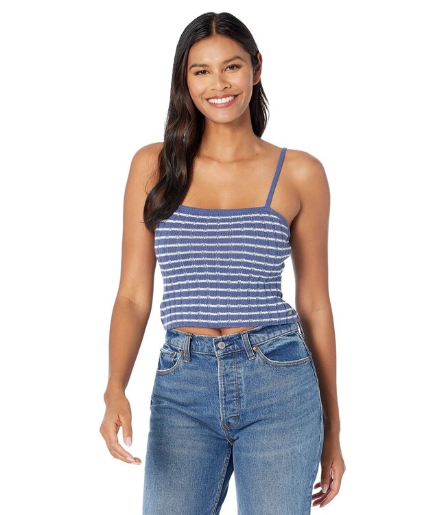 The Roxy Dream Sign Stripe Bijou Blue Coast to Coast LG (US 11) offers a stylish and comfortable option for women's casual wear. Made with an allover striped pattern, this tank top is designed for easy pull-on wear and features adjustable spaghetti sleeves for a customized fit.