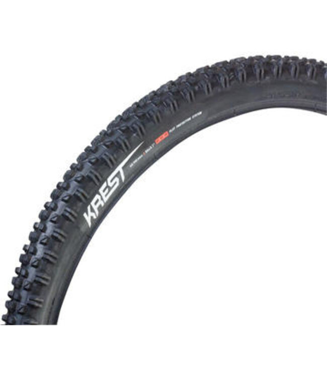 The Serfas Krest 29-inch tire is designed for cross-country and all-mountain biking, delivering speed and reliability. With ramped, medium-height knobs at the center, this tire ensures a fast ride, while the tightly spaced lugs provide exceptional grip and stability.