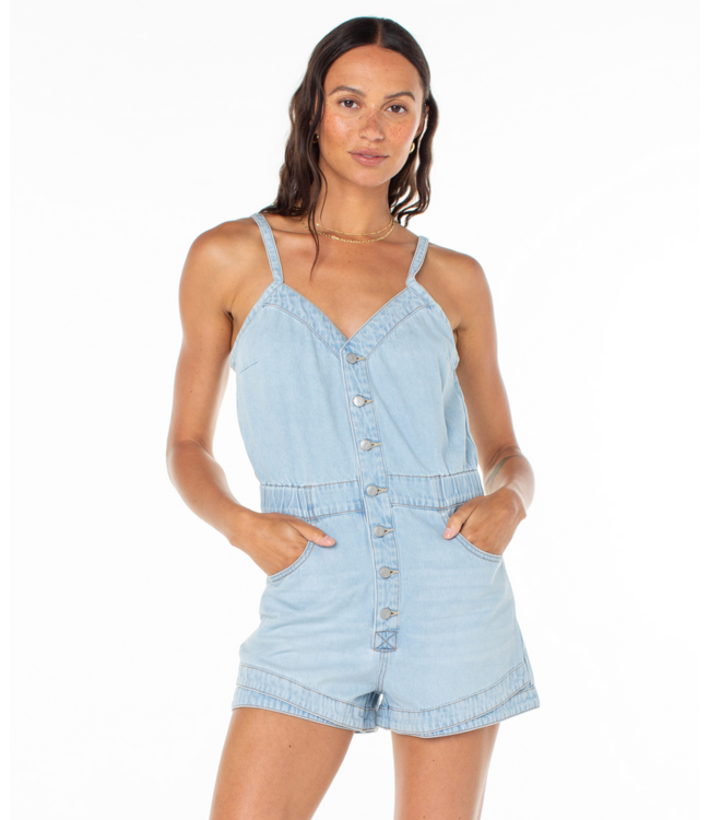 Designed in a Saltwater Denim Wash, the Naia Romper is ideal for both beach outings and city strolls. Its relaxed fit and lightweight fabric make it easy to wear all day long.