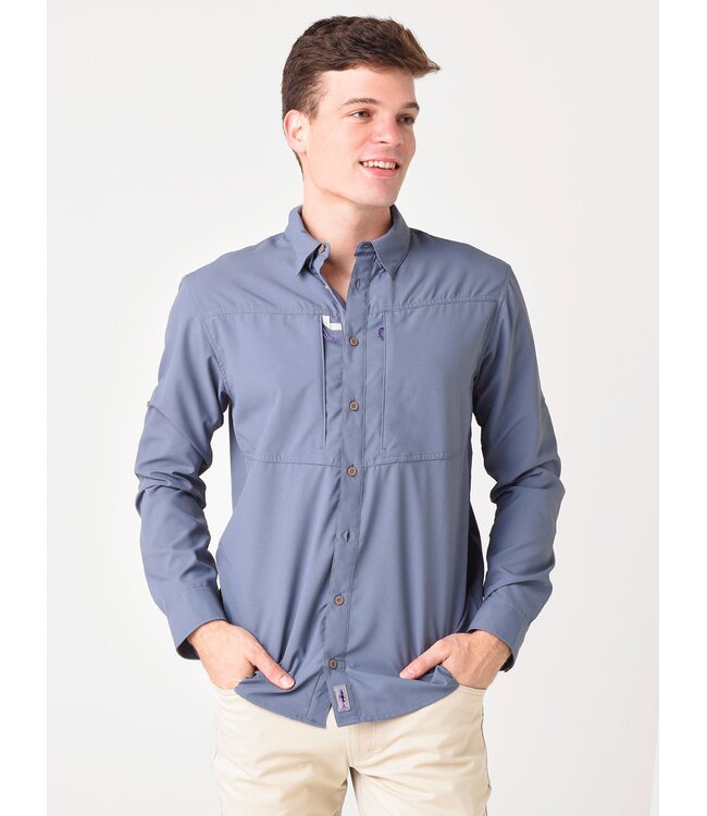 Featuring a double-layer collar with hidden snaps, it offers additional neck coverage when needed. The shirt includes two large chest pockets with stainless zippers for secure storage of essentials and a tool holder near the right pocket for added functionality.
