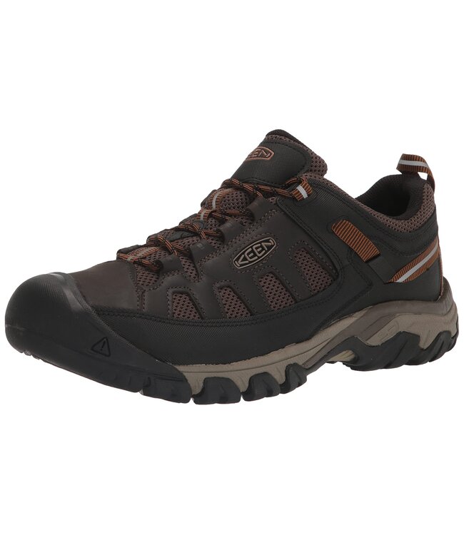 The KEEN Men's Targhee Vent Low Height Hiking Shoes are designed for outdoor enthusiasts seeking comfort and durability. These hiking shoes feature a water-resistant oiled nubuck leather upper with vented mesh panels, ensuring breathability and comfort on the trails. The breathable mesh lining keeps your feet cool, making them perfect for warm weather hiking.
