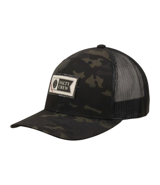 The Salty Crew Topstitch Multicam Black Retro Trucker is a stylish and durable hat designed for those who love the outdoors. Combining 65% polyester and 35% cotton, this structured six-panel cap offers both comfort and resilience. Featuring a mid-crown height and a screenprinted canvas patch, it provides a classic yet modern look that suits various styles.