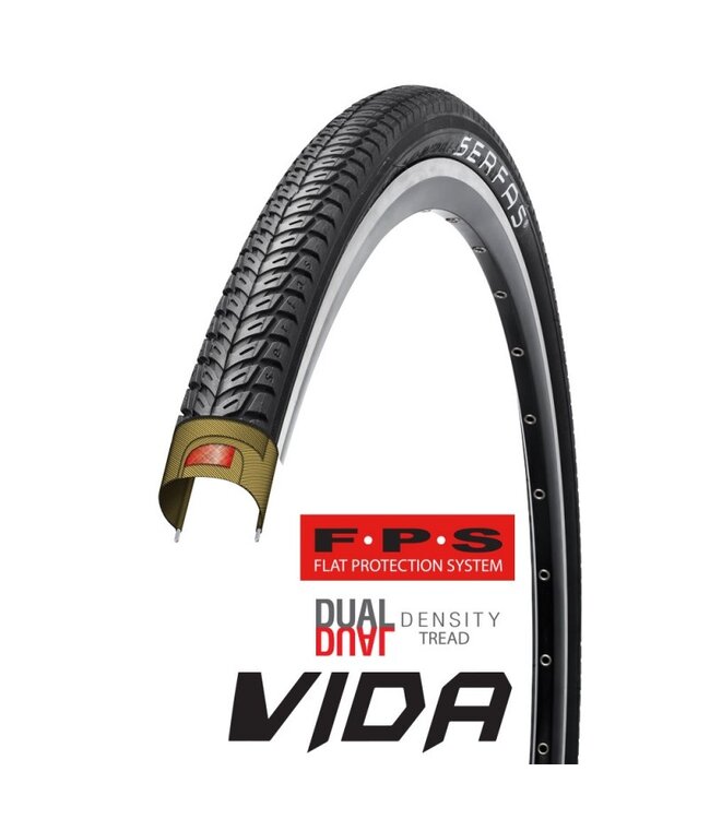 The Serfas HTK Vida Hybrid Tire is designed to deliver exceptional performance on a variety of surfaces, providing a smooth and confident ride whether you're on pavement, dirt, or gravel. Featuring the FPS Flat Protection System, these tires are engineered to withstand the rigors of urban biking while offering enhanced durability.